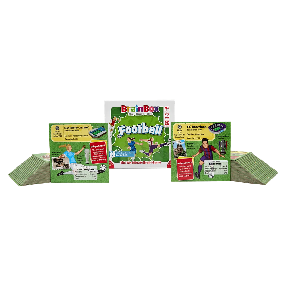 ¿Qué puedes ver en 10 segundos? Intenta memorizar las imágenes de tu carta en 10 segundos. A continuación, tendrás que responder a una pregunta sobre la carta que has visto. Brainbox: Fútbol, diseñado para que juegues con tus familiares, te ayudará a mejorar tus habilidades de observación y memoria.