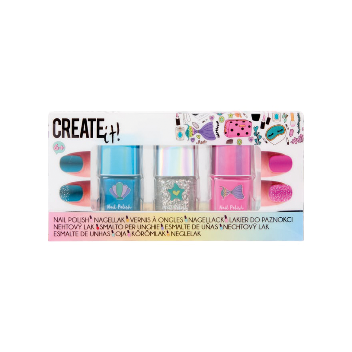 ¡Dale color y brillo a tus uñas con el Set de Esmaltes Create It! Incluye 3 esmaltes en tonos azul, rosado y glitter plateado para dar un toque brillante y mágico, diseñados especialmente para niñas desde 6 años. Su fórmula está pensada para el uso infantil, es fácil de aplicar y remover, ideal para juegos creativos y fiestas de amigas.